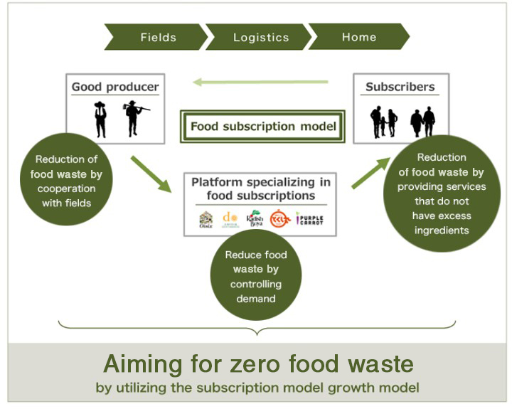 The Group has built a growth model based on subscription food services and developed multiple businesses centered on the domestic home delivery business. Thanks to this business model, food waste levels are low across their respective supply chains from production (farms), distribution, to consumption (tables).
