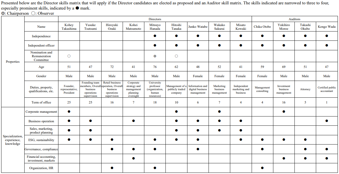 The Nomination and Compensation Committee, a newly established voluntary committee, will use this skills matrix as a reference in formulating candidates for the next term of directors and succession plans.
