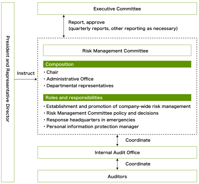 The Group has established the Risk Management Committee as its organization for risk management. The committee reports directly to the president and consists of a chairperson, members representing each department, and an administrative office.
